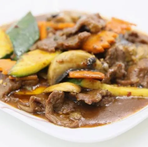Sliced, tender beef and scallops marinated in special delicate brown sauce and served with selected fresh vegetables.