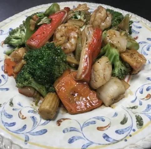Tantalizing combination of shrimp, scallops, chicken, beef and mixed vegetables stir-fried together.